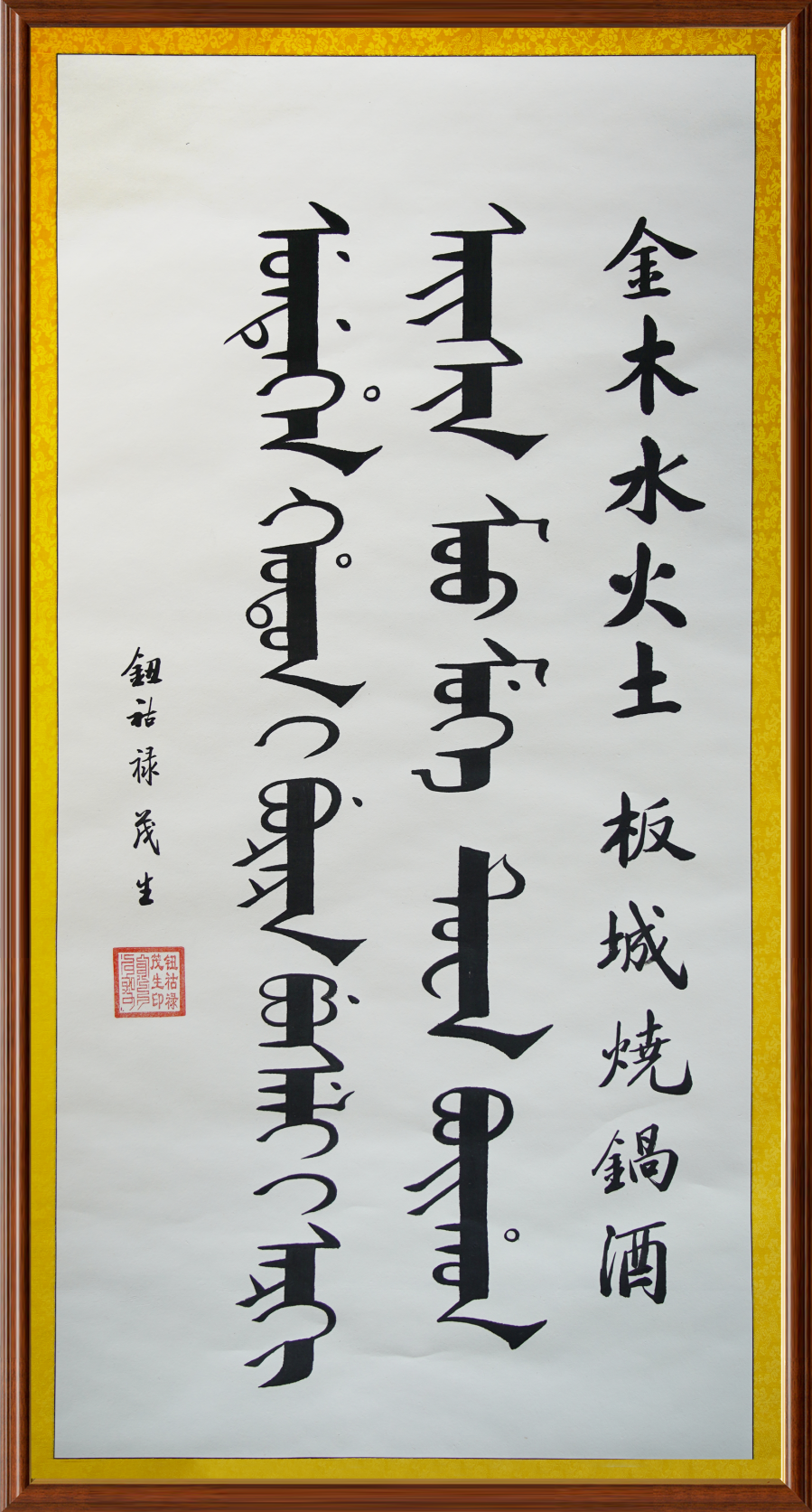 近日,板城酒業(yè)榮幸地收到了一幅珍貴的書法作品。這幅作品不僅體現(xiàn)了板城酒業(yè)深厚的文化淵源,更用滿漢兩種語言書寫了“金木水火土,板城燒鍋酒”的千古妙對,成為了板城燒鍋酒博物館館藏的一件獨特藝術(shù)瑰寶。