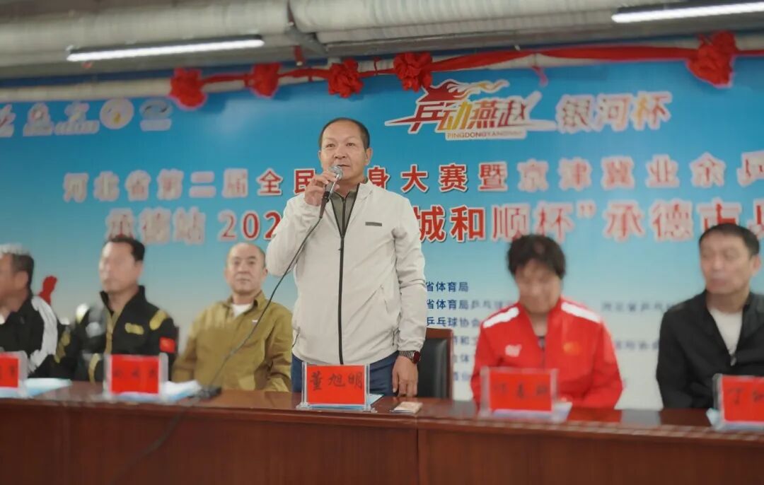 承德市政協(xié)副主席、工商聯(lián)主席、承德縣乒協(xié)總顧問(wèn)董旭明登臺(tái)宣布比賽正式開幕。