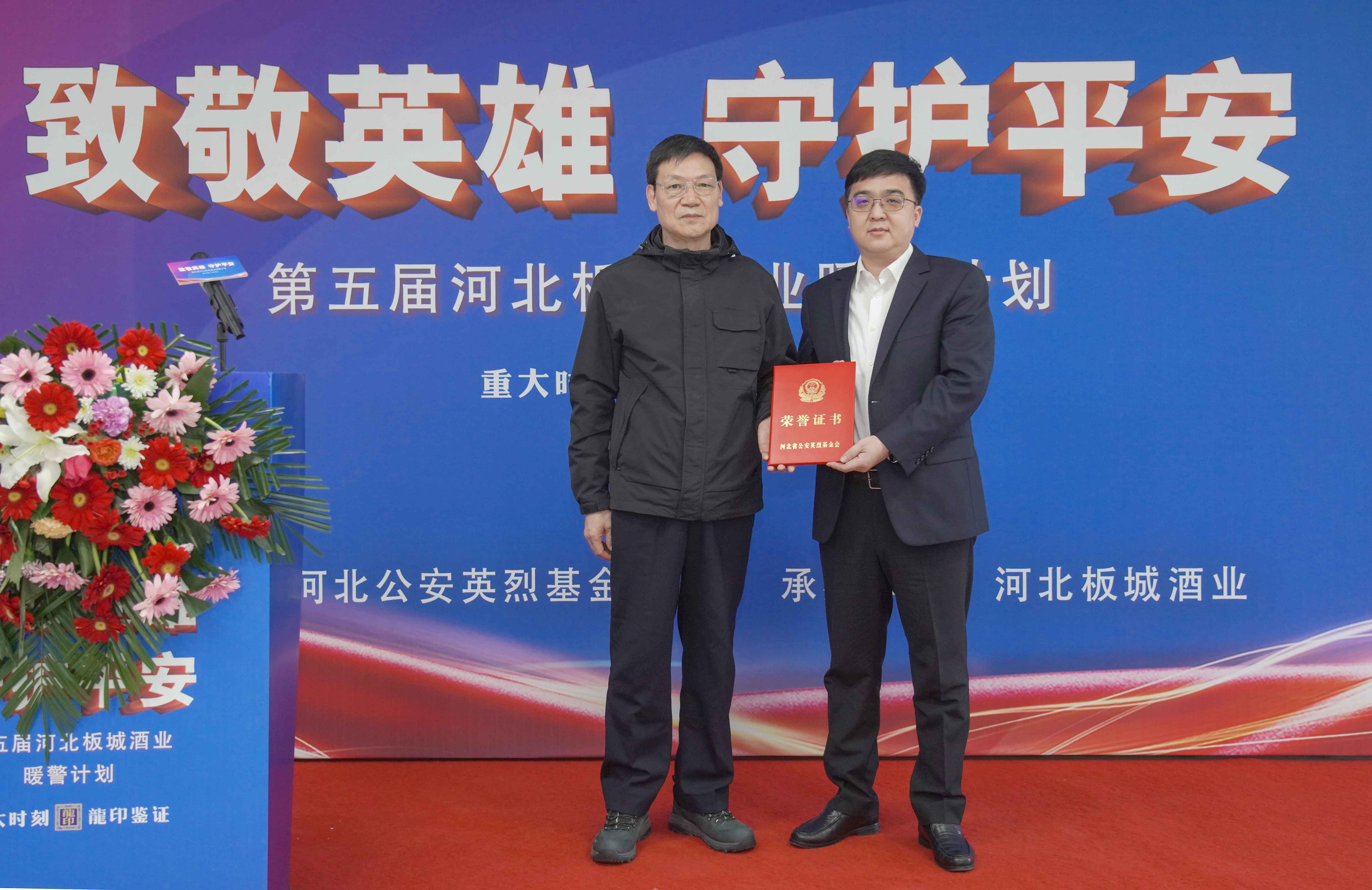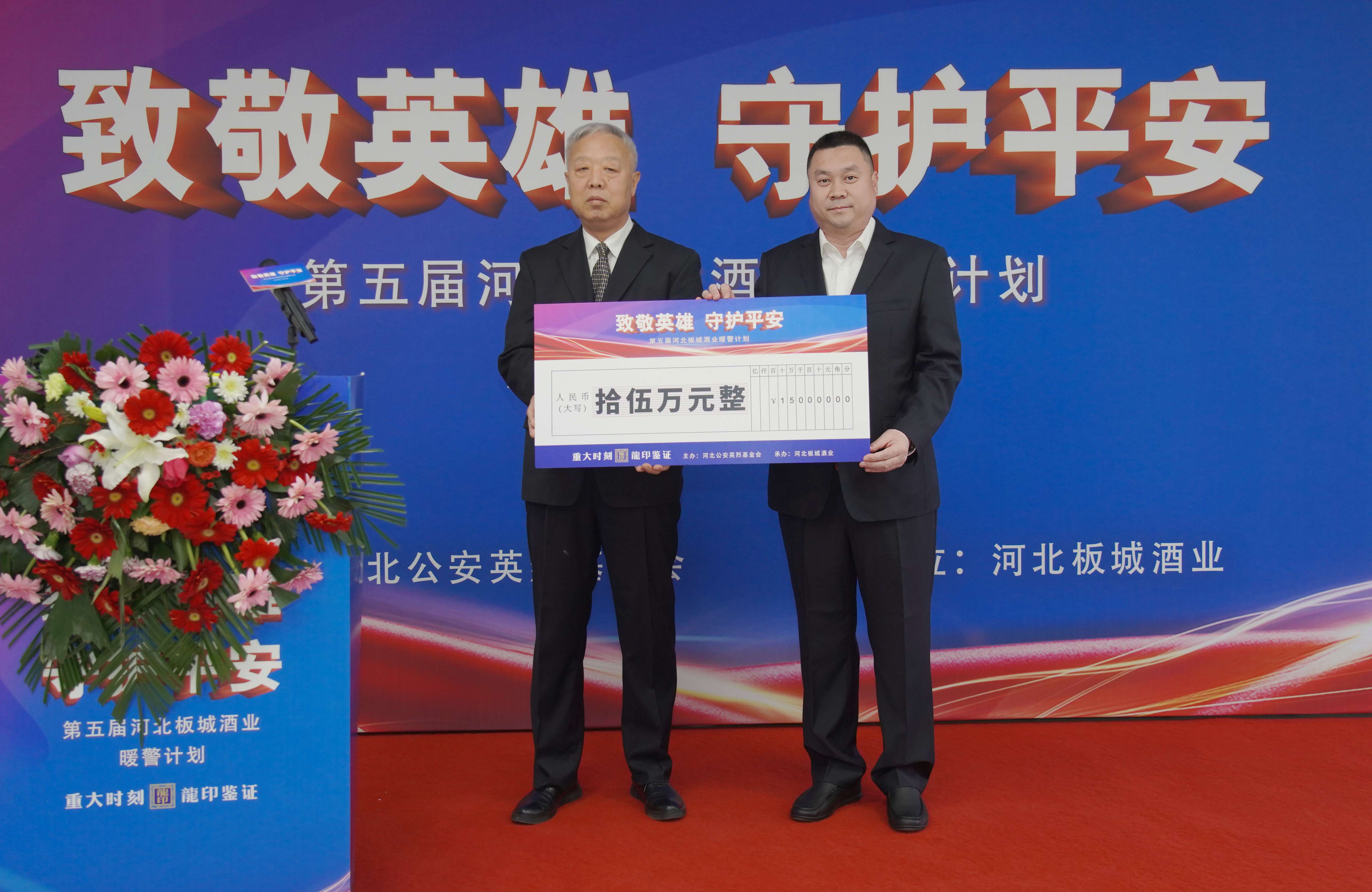 在捐贈(zèng)儀式上,板城酒業(yè)黨委書記、總經(jīng)理賀延昭向河北省公安英烈基金會(huì)捐贈(zèng)15萬(wàn)元暖警公益基金。