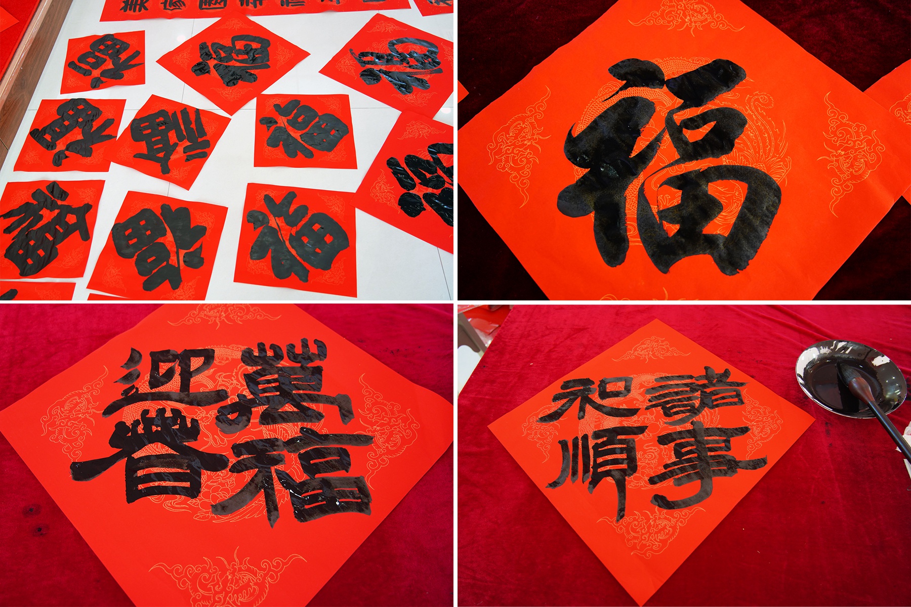 隨后,各位書法老師現(xiàn)場(chǎng)揮毫潑墨,書寫新春祝福。一張張紅彤彤的春聯(lián)象征著喜慶吉祥,傳遞著“萬(wàn)福迎春,諸事和順”的美好愿望。